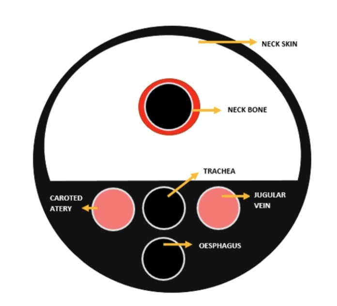 The figures show the location of the halqum (respiratory tract) and mari’ (food tract) of slaughtered animals. In the cross section of the neck of slaughtered animals, it can obviously be seen both the food and respiratory tracts, at the center of the neck. The pink coloured areas are the tracts that carry blood from heart to brain.