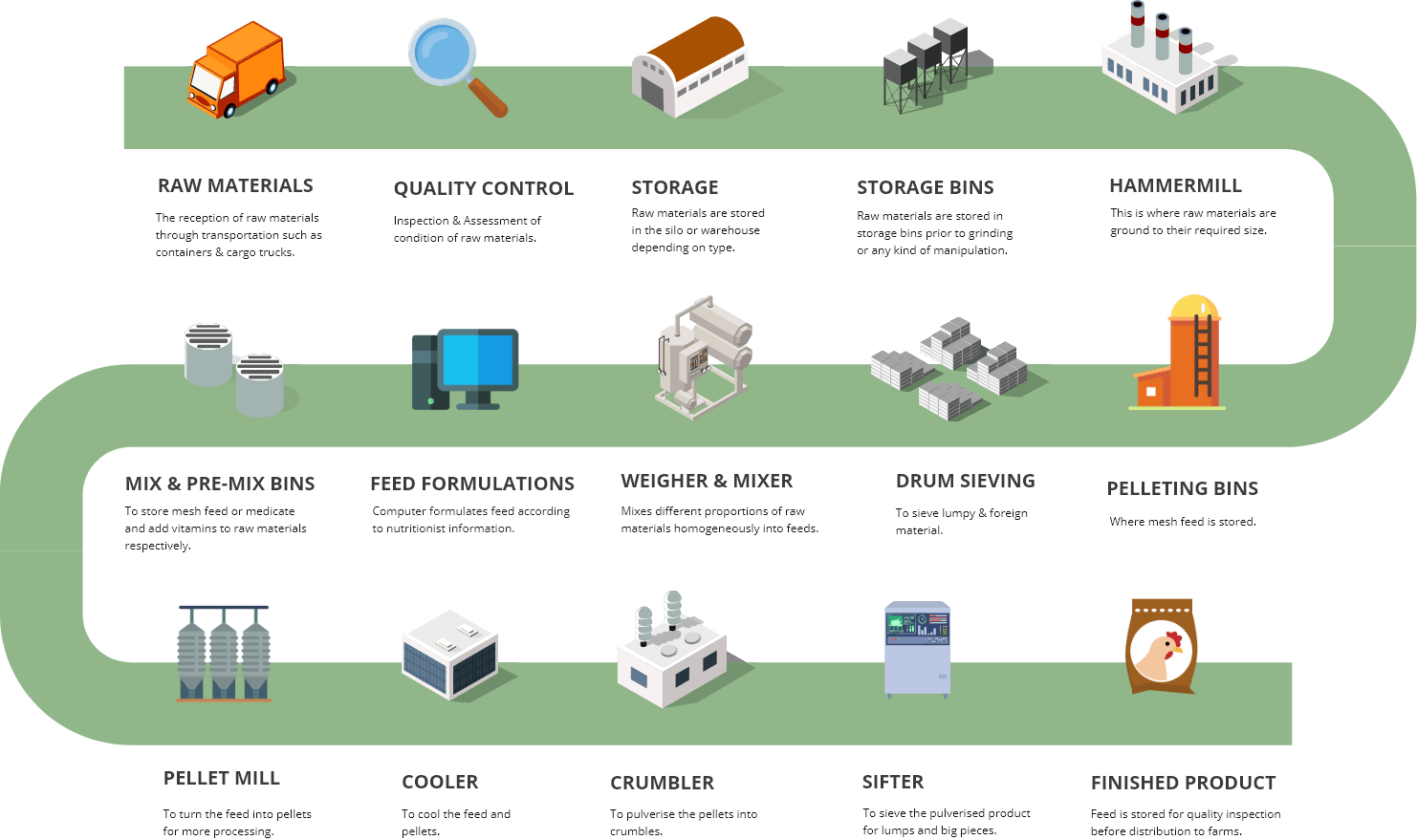 We are equipped with a fully automated blending & mixing system to meet precise nutritional standards formulated by our nutritionists. Blending accuracy, automatic adjustment of material in flight tolerances, and statistical analysis of actual ingredient inventory usage are crucial & prioritised to maximize weighing accuracy and inventory controls to achieve precise nutrition for consistent & high feed quality for our poultry.