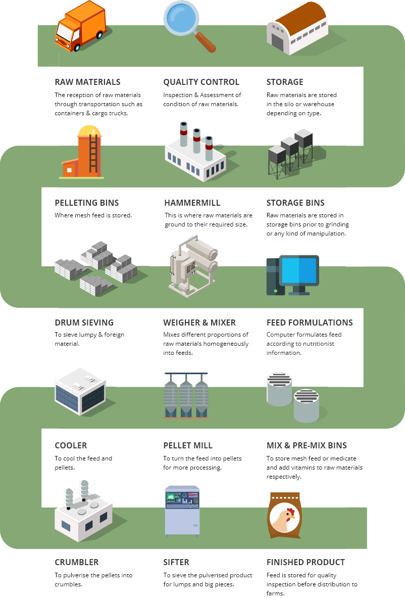 Our quality assurance starts before the process of purchasing whereby we demand ingredients made to specification (Certificate Of Analysis). Selection of suppliers is based on our approved supplier list. This pre-purchasing process ensures consistent high-quality feed. We also ensure our suppliers take note of the amount of anti-nutritional factors in our feed such as mycotoxin levels, free fatty acids (FFA), trypsin inhibitor.